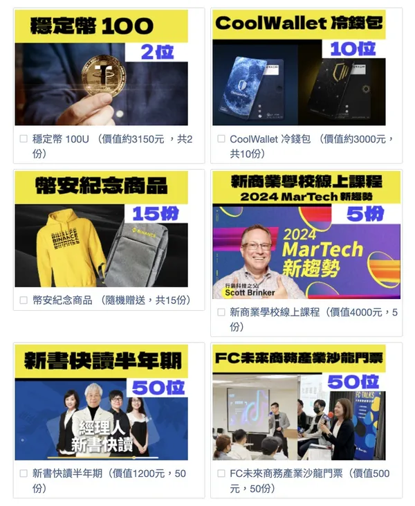 我們更沒有忘記在這一年支持我們的所有讀者與觀眾,從2023年12月29日~2024年1月31日,推出「一週年寵粉行動」,只要成為《WEB3+》會員、領取NFT會員卡,就有機會抽中100 U、CoolWallet 冷錢包,以及全球最大交易所幣安(Binance)的熱門周邊等好禮。