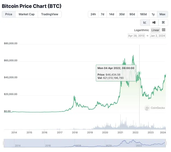 根據外媒《Coingecko》數據,比特幣上一次達到45,000美元是在2022年4月5日,已經是將近20個月以前了,但當時的漲勢並未持續太久,比特幣於同年11月跌至15,742美元的低點。