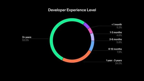由經驗豐富的開發者建構的項目,通常在獲得新用戶的表現相對較好,由此可推論開發經驗將直接影響公鏈的整體成功。根據統計,Solana 開發者生態系中,有超過一半擁有至少 3 年以上的經驗,這些開發者為 Solana 帶入了強大的開發動能。