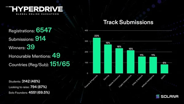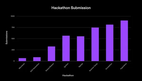 自創立以來,Solana 基金會便將 Solana Hackathon 作為評估開發者生態系健全程度的重要指標。為了提供開發者們實質的幫助,自 2020 年以來 Solana 基金會已募集了超過 60 億美元的資金,贊助了八場 Hackathon,並成功啟動了超過 3,000 個專案。值得注意的是,專案提交總數隨著每次 Hackathon 的舉辦都在不斷增加,而最近的 Solana Hyperdrive 甚至有超過 900 個專案提交,打破過往的紀錄。