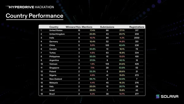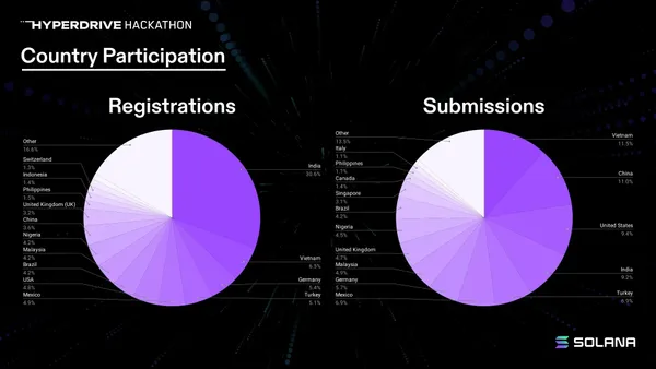 Solana 基金會並未每日追蹤區域發展的數據,而是透過每六個月舉辦一次的 Solana Hackathon 來觀測各區域的成長速度。最近的一次駭客松 Hyperdrive 的參與者來自 151 個國家,最終有來自 65 個不同國家的參與者提交了最終專案。