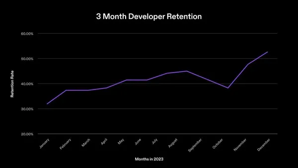 在 2023 年,Solana 生態系中的開發者留存率從 31% 成長到 50% 以上,數據說明現今比以往留住了更多新加入生態系的開發者。