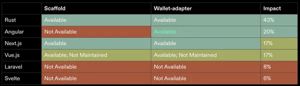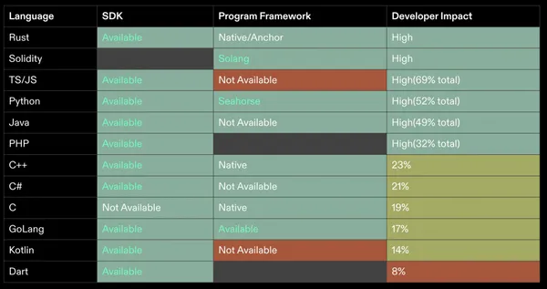 Solana 擁有一套強大的 SDK,而在 UI 框架方面,Solana 則集中使用 React 和 Next.js 工具。針對各種程式語言,我們可以用下列三個指標來評估: