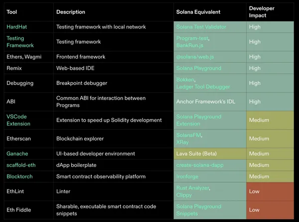 對於 EVM 生態可用的大多數主要工具,都存在 Solana 的等效工具。考慮到 Solana 相對於 EVM 的新興地位,上圖顯示 Solana 的開發者生態系正在積極地建構所有必要的工具以提升 Solana 開發者的使用體驗。儘管尚未達到 Foundry 的高標準,Solana 生態系仍正不斷改進和優化其開發工具。