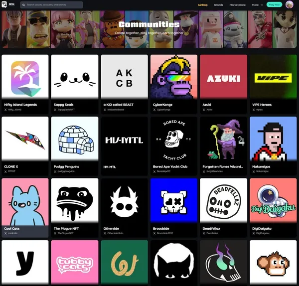 根據官網資訊,目前合作的NFT項目有無聊猿(BAYC)、Azuki、胖企鵝Pudgy Penguins、Cool Cats、Doodles等,幾乎喊得出名字的大型項目都包含在內。只要是這些NFT的持有者,都可以在《Nifty Island》遊戲中,把自己的PFP變成3D人物,和其他社群相見歡。