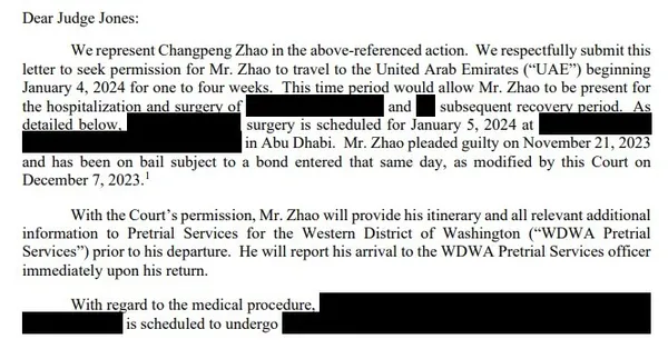 在去(2023)年12月22日,趙長鵬的律師寫信給美國聯邦法官,希望能允許趙長鵬在1月回到阿拉伯聯合大公國,大約停留一到四週左右的時間,因為趙長鵬想要回去探望正在住院接受手術的親友。