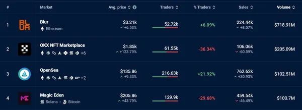 過去一年推出跨鏈支援、獎勵制度、甚至是多鏈錢包的Magic Eden,是除了Blur、OKX外,正在崛起的一股強大勢力,目前根據DappRadar數據,交易量排名NFT交易平台第四,僅次於OpenSea、OKX跟龍頭Blur。