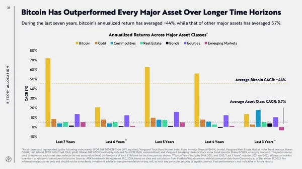 先從最直觀的投資報酬率來看,過去七年裡,比特幣的投資年化報酬率遠遠超過主要資產類別,該公司指出,比特幣不僅是一種新的投資選擇,近 5 年間與傳統資產的相關性也達到 0.27,凸顯了其多元化優勢,考慮到全球可投資資產規模高達 250 兆美元,即使機構投資人以最小配置進場,也可能對比特幣價格有顯著的影響。