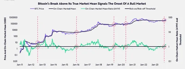 而作為方舟的原始指標,鏈上市場平均值一直是比特幣風險規避和資金進場之間的可靠分界點,從歷史上看,每當比特幣的價格高於鏈上市場平均值時,通常表明牛市的早期階段已經開始。