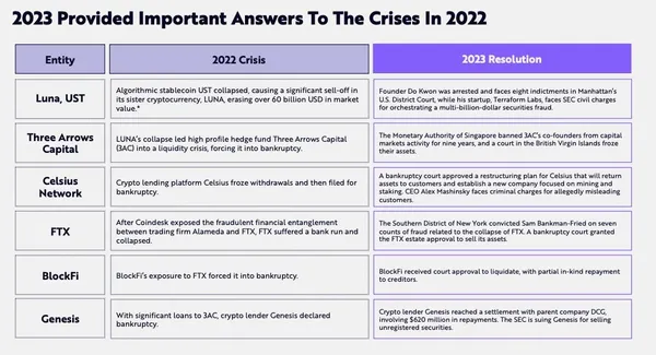而從方舟報告可以看到,包括 FTX 最近宣布計劃全額償還債權人、Celsius 向一家新企業分配 30 億美元和股權分配作為破產解決方案,以及三箭、LUNA 創辦人被捕並面臨清算在內,2022 至 2023 年間引發加密貨幣熊市的幾大危機,大部分已經進入收尾階段。