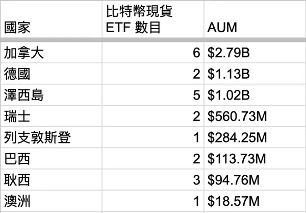 在世界各國的現貨比特幣 ETF 中,排名居前的包含: