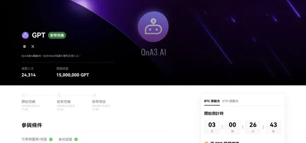 交易所OKX宣布,將在OKX Jumpstart上上架新項目 GPT(QnA3.AI),用戶可在2024年2月26日 6:00(UTC)開始質押比特幣( BTC)和以太幣( ETH),以此換取 GPT 代幣,活動一路進行到2月28日,每人最多可質押0.2BTC及3.5ETH。
