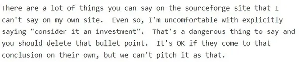 中本聰在信件中指出,將比特幣視為一項投資的說法風險太高,也讓他感到不安,中本聰更強調「我們不能直接這樣宣傳。」