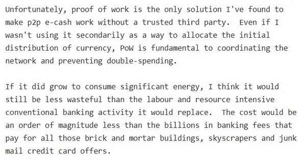 根據這些電子郵件的發送時間,中本聰在2009年就已經預見,比特幣未來很可能會消耗大量的能源,他也同時認為,比起勞力和資源密集型的傳統銀行,比特幣還更節省能源與成本。