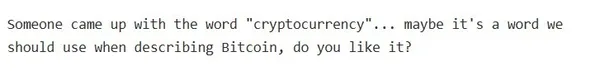 中本聰在信件中提到,「有人想出了『加密貨幣』這個詞......也許這是我們在描述比特幣時應該用的一個詞,你喜歡它嗎?」