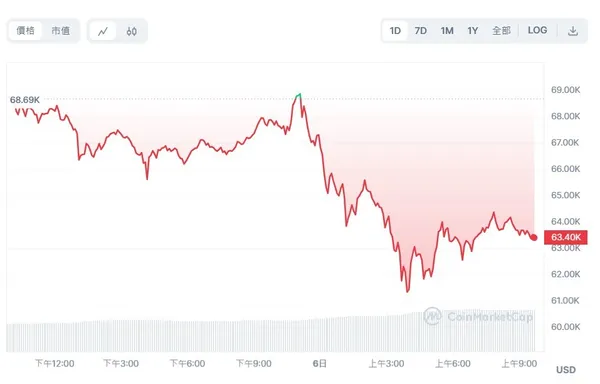 截至文章上稿前,比特幣價為63,095美元,和過去24小時相比,下跌7.8%。