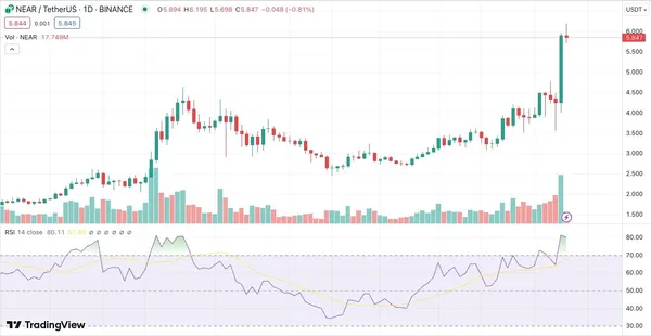 截至今早撰稿時,$NEAR 一度暴漲至 6.195 美元高點,以昨日低點 4 美元計算,等於累計上漲了 54.8%。