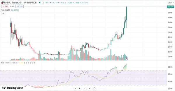 這個單純出席活動的消息,似乎被市場解讀為重大利好。$RNDR 在一夜之間狂飆,截至今早撰稿時一度漲至 10.256 美元高點,從昨日低點 6.583 美元計算,等於累計上漲超過 55%。其餘 AI 代幣也隨之上漲,例如 $FET 就在日內暴漲 48.3%、$WLD 也上漲近 20%。