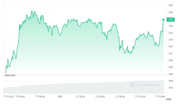 然而,受到大盤持續上漲影響,BNB幣價格在3月8日終於出現飆升,並在3月10日突破500美元大關,觸及2年來的最高點537美元。截至文章發稿前,BNB價格約為532美元,過去24小時內上漲6.5%。
