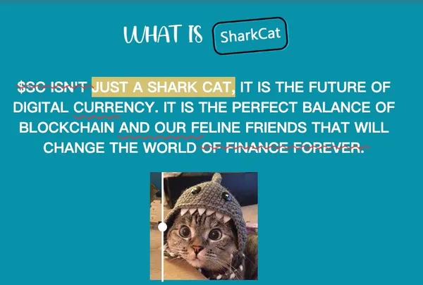 SharkCat的官網描述也非常簡單、暴力,團隊宣稱$SC不只是一隻鯊魚貓,它代表著加密貨幣的未來,是區塊鏈技術與貓咪的完美結合,更暗示將永遠改變金融世界。