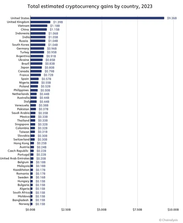 報告顯示,全球幣圈投資者在2023年的已實現總收益高達376億美元,其中美國以93.6億美元遙遙領先;英國排名第二,利潤估計為13.9億美元;越南、中國、印尼、印度、俄羅斯和韓國,也是實現收益超過10億美元的國家之一;台灣一整年的加密貨幣收益,約為3.1億美元。