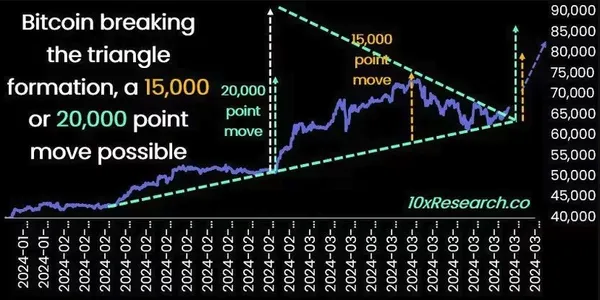 比特幣突然反彈衝回 7 萬,代表回調盤整走勢結束了嗎?10x Research 分析師指出,根據對稱三角形型態,本次突破可能會讓比特幣從 63,000 美元區間再上漲 15,000 至 20,000 美元,即衝向 83,000 美元目標價。