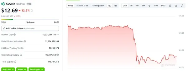 不過KuCoin原生代幣KCS出現下跌,Coingecko數據顯示起訴消息傳出後,KCS跌至12美元區間,24小時跌幅超12%。