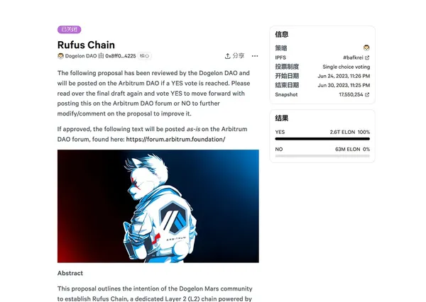 2023年6月,Dogelon Mars社群提出了一個新的方案。建立一個社區專用Layer 2(L2)鏈Rufus Chain。 Rufus Chain使用Arbitrum Nitro技術驅動,由Dogelon DAO運營,致力於提高生態系統的可訪問性,同時為未來的L2 項目鋪平道路。該方案最終幾乎以全票YES的結果通過,並緊鑼密鼓的開始建設工作。