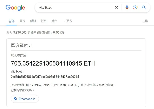 2023年五月,Google就將以太坊錢包餘額搜尋功能整合到搜尋引擎中,讓用戶不用到「Etherscan」就可以看到特定錢包裡面剩餘的以太坊。