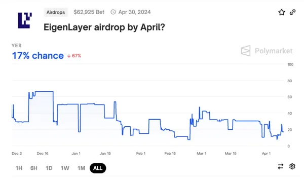 另一場「EigenLayer 4 月底前是否空投」的預測吸引了更多投注,目前已超過 62,000 美元,但認為會空投的機率只有17%。