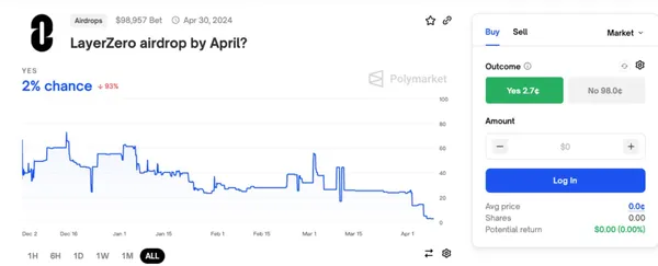 目前,參與預測的用戶大多關注第二層解決方案(Layer2)Blast、Base,以及再質押項目 EigenLayer、跨鏈項目 LayerZero、SocialFi 項目 Friend.tech 等幣圈熱門項目, 已經有價值約 10 萬美元的投注預測 LayerZero 是否會在 4 月底空投,而押注「YES」的價格僅為 2.7%,代表用戶認為 YES 的機率很低。