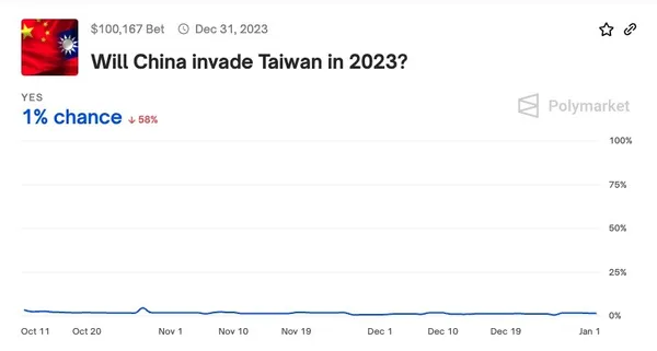 有趣的是,去年 Polymarket 用戶也曾發起一樣的預測,讓大家對「2023 年底前中國是否攻台」來下注,最終結果顯示攻台機率僅為 1%,但押注的資金量比較少,僅價值約 10 萬美元。
