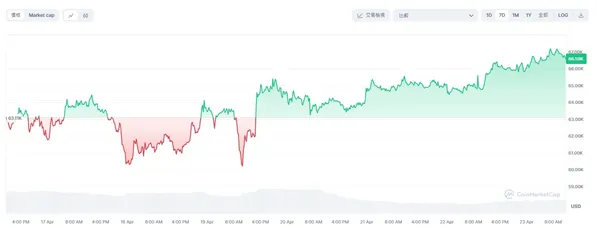 4月20日,比特幣(BTC)網路在第84萬個區塊被開採後,成功進行了第4次減半事件,挖礦區塊獎勵也正式從6.25顆比特幣減少到每個區塊3.125顆。截至文章發稿前,比特幣價格落在66,942美元,和過去一周相比,上漲了6.12%。
