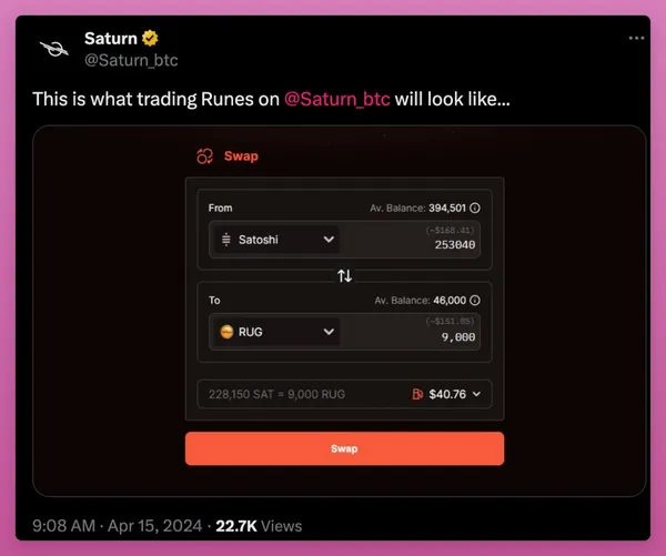 符文正在為Rune代幣的多個協議和基礎設施鋪平道路,例如Saturn正在為符文建立一個DEX或Liquidium正在建立一個借貸市場,但完善用戶體驗需要時間。