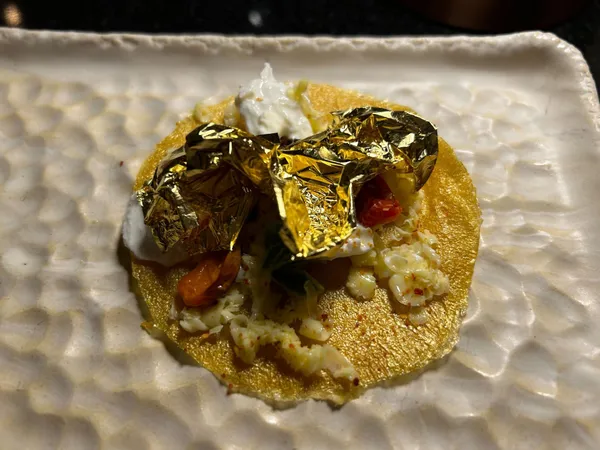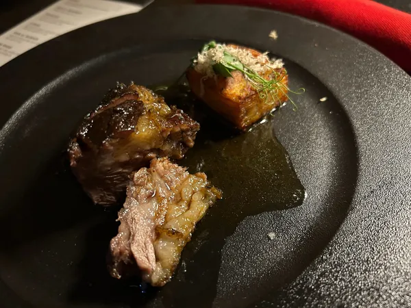 第一道前菜就是杜拜,它是薄餅加奶油,但上面擺了一大片金箔,我這輩子第一次這麼仔細的品嘗到金箔的味道... 而阿布達比是倒數第二道主菜—香嫩多汁肥美的烤羊膝佐松露馬鈴薯,它就是這麼樸實無華。