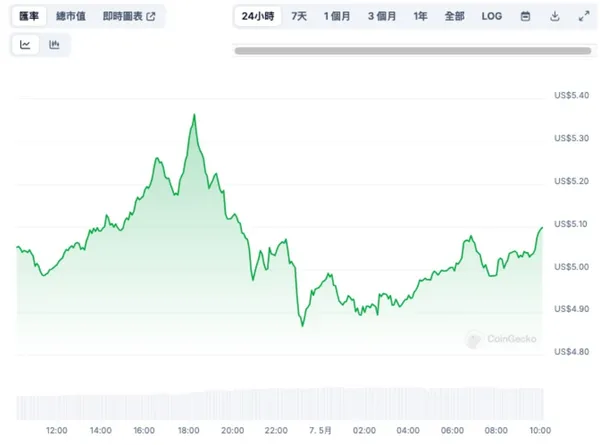 截至撰稿時,$PENDLE 價格為 5.07 美元,單日上漲 1.3%,單週上漲 6.1%。