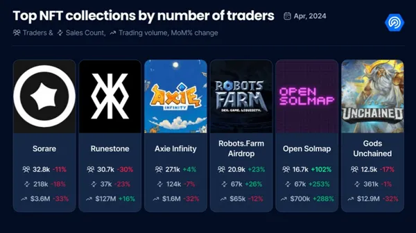 DappRadar分析了擁有最多交易的NFT收藏,遊戲相關的NFT系列表現良好,包含體育遊戲Sorare、區塊鏈遊戲始祖Axie Infinity,以及受到玩家歡迎的卡牌戰略遊戲Gods Unchained,這些遊戲中的NFT商品都吸引了不少交易者。