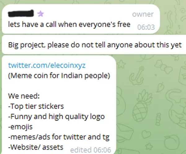 在2024年1月3日,許多KOL聚集在一個電報群中,計劃以「印度人的迷因」的名義推廣迷因幣ELECOIN。 爆料人Rahul在推文中稱該代幣已於23年末進行「秘密TGE」,大部分代幣供應已被內部人士獲取。 同時項目方對所有開發者和KOL承諾盡快為其工作支付報酬(以USDC形式)。