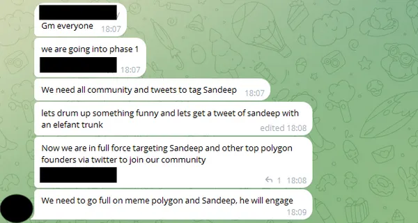 團隊計劃以Polygon創辦人Sandeep的寵物大象作為媒介來推廣ELECOIN的故事,並希望透過Sandeep發布大象寵物的照片來推動ELECOIN話題炒作。 並且這一想法獲得Polygon「Top級別人士」的支持。