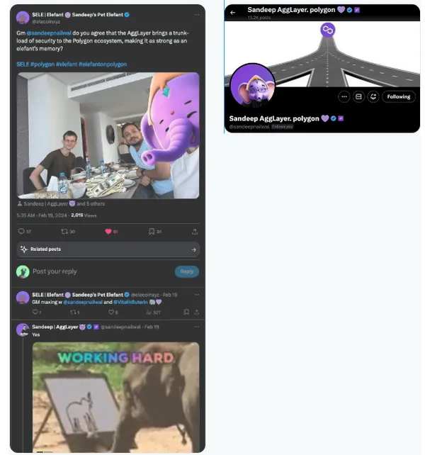當然這一切都是提前計劃好的,從Sandeep與ELECOIN官方帳號的第一次互動到Sandeep將自己的推特頭像換成大象Meme圖(這有點像在模仿當時 Solana創辦人將頭像換成SillyDragon所引發的 Silly代幣上漲),發文者認為 事件發展的每一步都經過ELECOIN乃至整個Polygon高層團隊的精心設計過。