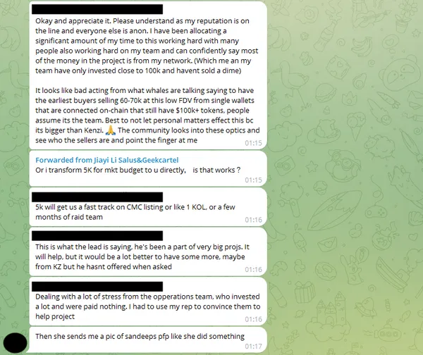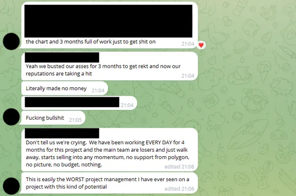 由於在交付項目後Rahul並沒有被踢出群聊,這也讓爆料人Rahul在接下來三個月中親眼見證「有錢人是如何利用其他人的時間和金錢沒有任何成本地進行惡意拋售、精神操縱與公然欺詐。」