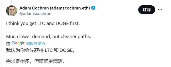 Cinneamhain Ventures的合伙人亞當·科克倫(Adam Cochran)認為,由於監管情況較為簡單, 萊特幣(LTC)或狗狗幣(DOGE)可能會成為下一個獲得ETF批准的加密貨幣 。萊特幣和狗狗幣都採用類似比特幣的工作量證明(PoW)共識機制,這可能使它們的監管路徑不那麼具爭議性。