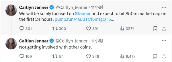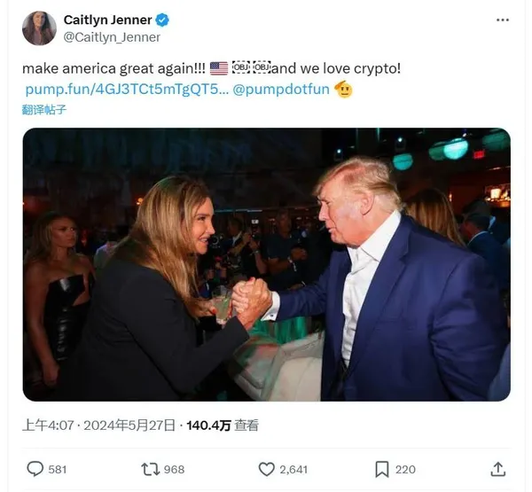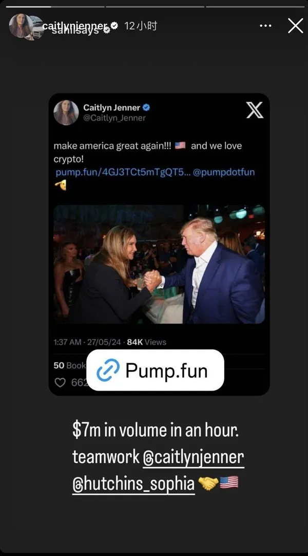凌晨4點左右,凱特琳·詹納的推特帳號po出一張與川普握手的照片配文「make america great again!!! and we love crypto!」並附 pump.fun 的 $Jenner 代幣連結。 緊接著凱特琳·詹納又在推特上圈出Ansem、SolJakey、Pauly幾位著名加密 KOL 並稱其為「crypto kings!」。