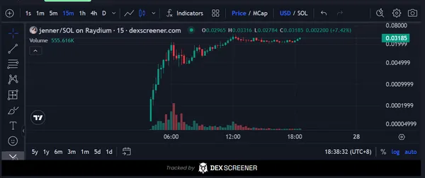 影片發出後,猶豫不決的散戶們放手一搏,幣價最終一飛衝天,截至目前$Jenner距離早些時候已上漲近千倍,幣價仍處高位。