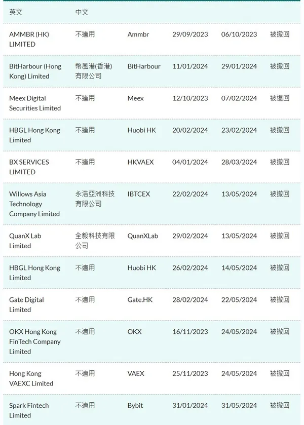 不過令人感到意外的是,未能符合要求或是撤回牌照申請的交易所竟有12家之多,其中OKX、Bybit交易所也在其中,而幣安、Coinbase等全球最大的交易所也未出現在申請名單中。