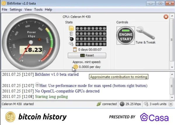 比特幣在價值10美元時挖礦的情況如下圖,Allinvain仍可使用家用電腦。他按下按鈕就生成BTC。