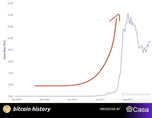 到2011年,挖礦難度飆升。哈希率飆升至4 TH/S。而2010年,哈希率僅為這一數字的0.001%——增長了114,000%。