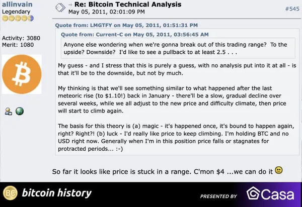 Allinvain很快成為比特幣鯨魚,擁有超過2.5萬枚比特幣。2011年初,Allinvain為比特幣價格上漲而歡呼,當時比特幣價格飆升至30美元的高位。這是第一次比特幣泡沫。Allinvain當時擁有價值50萬美元的「魔法」貨幣。