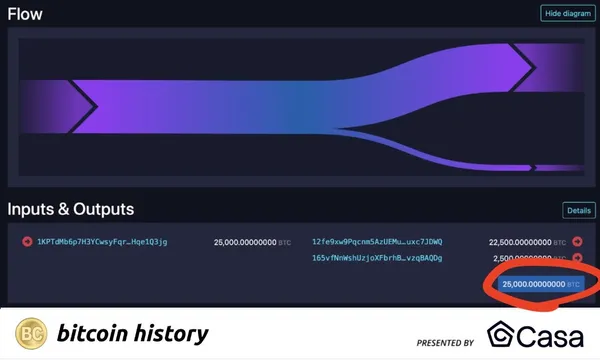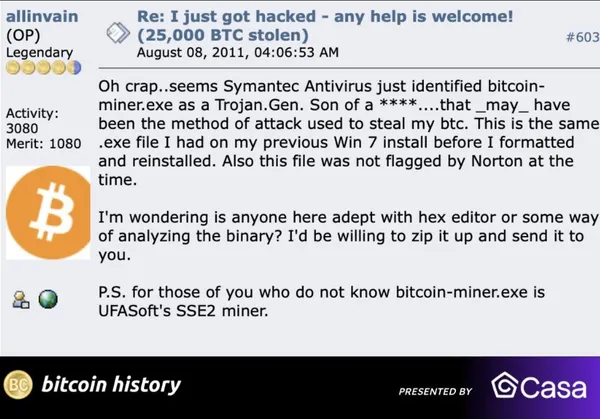Allinvain看到錢包裡有一筆2.5萬枚BTC的交易。就這樣,他所有的BTC全部被盜。