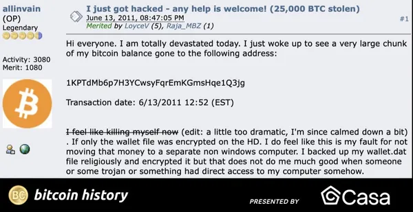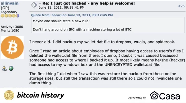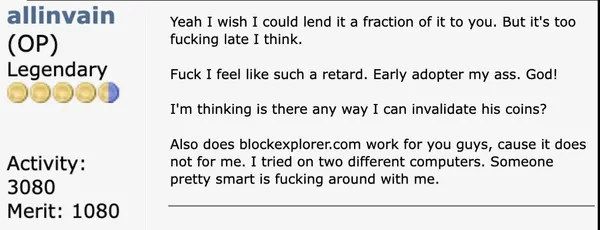 時至今日,Allinvain的故事依然在警醒人們比特幣安全的重要性。